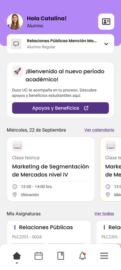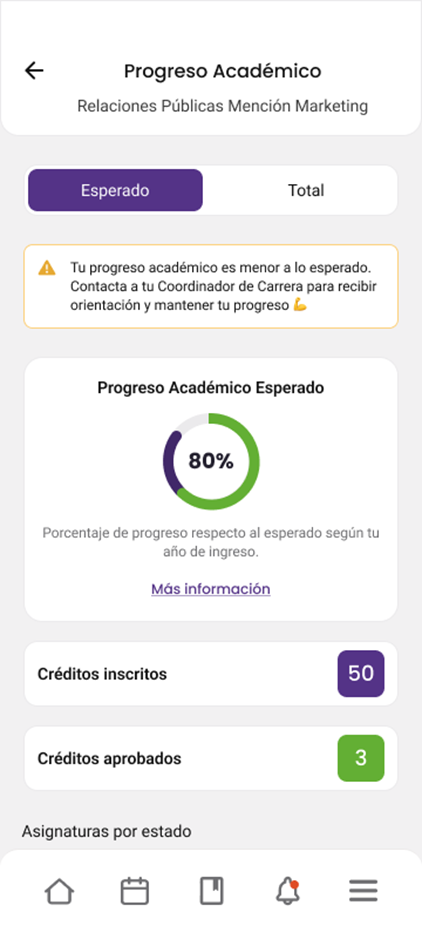 • Anticipación proactiva: implementamos un sistema de notificaciones contextuales en la sección de Asignaturas y Progreso Académico, que entregan personalizados y alertan sobre situaciones y plazos críticos, que permiten al estudiante, a tiempo, tomar decisiones informadas sobre su situación académica.