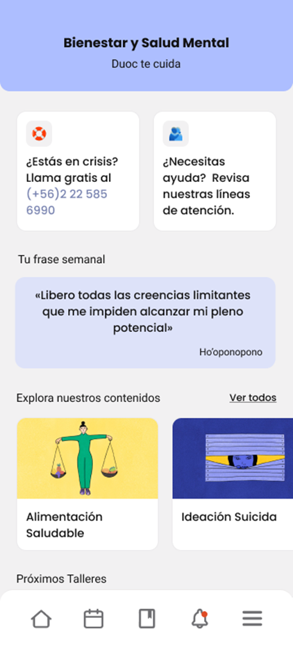 • Sección de Bienestar y Salud Mental como pilar de apoyo integral: implementamos un módulo que contiene desde artículos informativos hasta el servicio de agendamiento de horas de atención psicológica y línea telefónica de crisis. Este módulo reduce las barreras de acceso a servicios de salud mental, facilitando que los estudiantes den el primer paso hacia el bienestar integral de manera privada y segura.