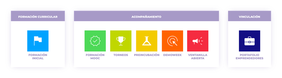 - Acompañamiento: Mentorías, preincubación, asesorías y demoweeks, MOOC y torneos que entregan herramientas prácticas y fomentan el pensamiento creativo.