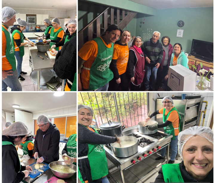 El equipo, compuesto por 16 personas, fue recibido por el Padre Danilo Almarza y la señora Adriana Zúñiga, conocida por sus compañeras voluntarias como “Nanita”. Con una dulce sonrisa, nos invitó a pasar tras bambalinas, directo a la cocina; nos entregó mallas para el pelo y guantes; mientras nuestra compañera Claudia nos entregaba pecheras verdes, que representa el color de la esperanza y la alegría que quisimos llevar a las voluntarias de la parroquia.