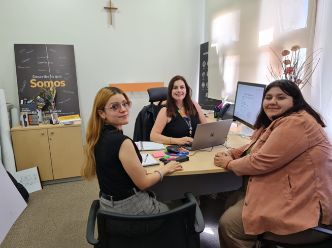 Foto N°3: Dominique Bignon Silva, jefa de Comunicaciones, Valeria Elías Villafañe, asistente de Comunicaciones, Valentina Cruz Llanquetru, alumna ayudante de Comunicaciones.